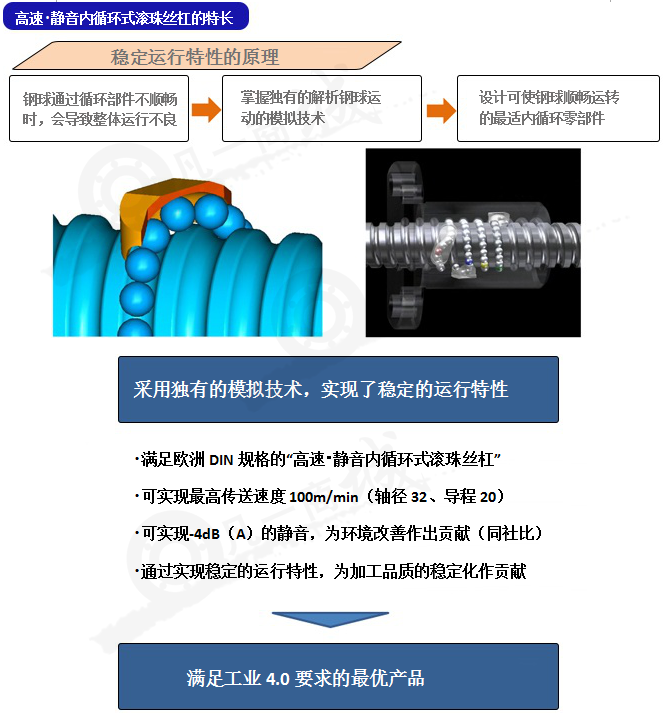 NSK采用獨有的高速、靜音技術,使內循環式滾珠絲杠的傳送速度可達到100m/min。縮短了機床的運行周期,為提高加工效率作出了貢獻。