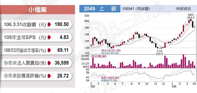 上銀科技(2049)今年對上銀滾珠螺桿、上銀直線導(dǎo)軌及機(jī)器人三大主力產(chǎn)品需求增溫,從去年第1季末到第2季初旺到現(xiàn)在,上半年訂單滿爆,生產(chǎn)線加班趕工,1至2月合并營收26.98億元,年增45.95%,擔(dān)心工具機(jī)廠重復(fù)下單,下半年轉(zhuǎn)趨謹(jǐn)慎,務(wù)實(shí)接單,全年合并營收有機(jī)會續(xù)創(chuàng)新高。