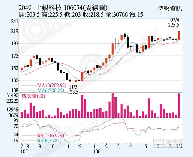 因今年工具機(jī)產(chǎn)業(yè)景氣好轉(zhuǎn)、大陸對(duì)自動(dòng)化設(shè)備及機(jī)器人需求持續(xù)增溫,上銀年底前訂單滿載,全年合并營(yíng)收有機(jī)會(huì)續(xù)創(chuàng)歷史新高,上周五自營(yíng)商雖賣(mài)出,承接買(mǎi)盤(pán)強(qiáng)勁,呈價(jià)穩(wěn)量縮走勢(shì),上漲1.5元而以218.5元作收,創(chuàng)2015年7月以來(lái)新高,周漲幅7.37%。