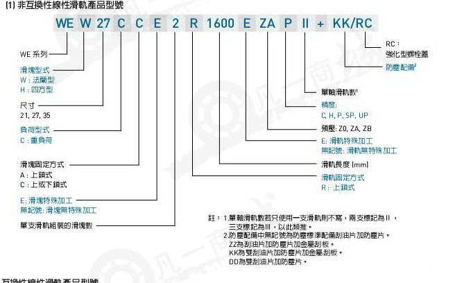 上銀導軌WE系列分為非互換性及互換性型兩種線性滑軌,兩者規(guī)格尺寸相同,主要差異點在于互換性型之滑塊、滑軌可單獨互換使用,較便利,但其組合精度無HIWIN互換性型之組合精度目前已達到一定的水平,對不需配對安裝線性滑軌的客戶而言,是一項便利的選擇。線性滑軌的產(chǎn)品規(guī)格型號主要標明線性滑軌尺寸、型式、精度等級、預壓等規(guī)格要求,以利訂貨時雙方對產(chǎn)品的確認。