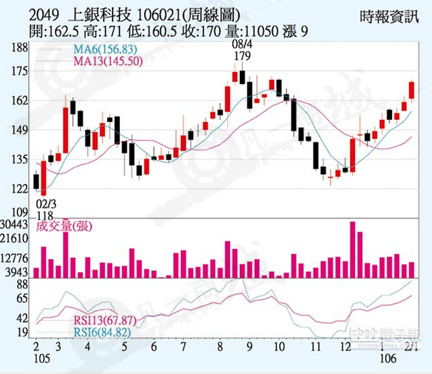 上銀大廠(2049)因滾珠螺桿、直線導(dǎo)軌及機器人三大主力產(chǎn)品,17年首季訂單因大陸對智慧自動化設(shè)備及機器人需求增溫而滿載,開始接第2季訂單,今年合并營收要挑戰(zhàn)200億元目標,上周五三大法人聯(lián)手買超1,599張,股價上漲7.5元、收170元,周漲幅5.59%。