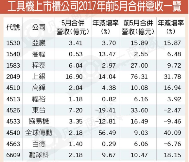 臺灣工具機族群上市柜公司因大陸、歐美市場訂單顯著增長,包括上銀科技(2049)、全球傳動TBI(4540)等公司,5月營收普遍傳捷報,東臺、協易機則因零件缺料及客戶交期遞延出貨,營收出現負成長;目前各工具機廠訂單能見度普遍看到第3季末,部分少數廠商看到10、11月。