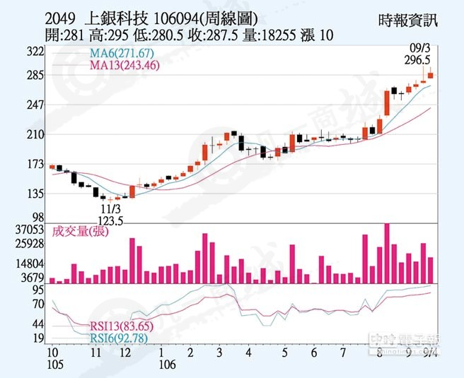 上銀科技(hiwin)受惠直線導(dǎo)軌及滾珠螺桿等關(guān)鍵零組件訂單滿手至明年底,加上德國漢諾威展接單增3~5成等利多題材,外資等法人連續(xù)買超,近三個(gè)月股價(jià)大漲近4成后,出現(xiàn)整理格局,上周五下跌5元收在287.5元,法人估在原料缺貨追單題材下,行情仍有望追高。