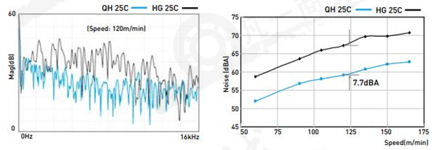 利用同步連接器可使?jié)L珠均勻等間隔的排列,滾珠和滾逐漸的相互撞擊金屬聲消失,尖銳的高頻聲音強(qiáng)度有效降低(見(jiàn)下圖),總和的噪音強(qiáng)度與舊有系列比較在各個(gè)速度域有效降低約低7.7分貝。