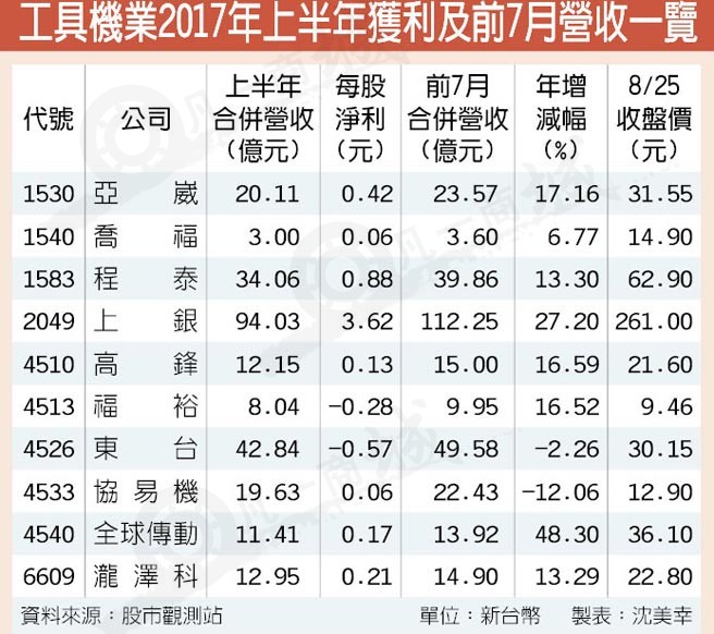 工具機(jī)接單持續(xù)好轉(zhuǎn),反映在下半年及獲利上,亞崴、程泰、上銀科技(hiwin)及東臺等大廠訂單能見度雖看到年底甚至明年首季,仍以集團(tuán)型態(tài)參加9月18日在德國漢諾威登場兩年一度歐洲工具機(jī)展?fàn)幦∮唵?,增添營運(yùn)動能。