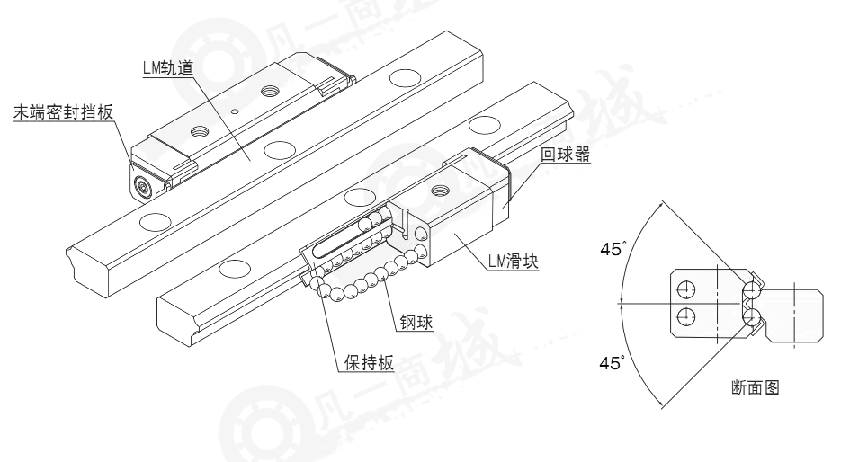 鋼球沿著LM軌道和LM滑塊上經過精密研磨加工的2列滾動面進行滾動;通過組裝在LM滑塊上的回球器,使鋼球列循環運動。