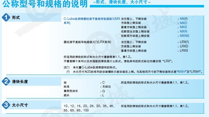 IKO直LRX系列可發揮最高滾動導向性能的圓柱滾子型直線導向設備:該系列IKO直線導軌是最大限度發揮圓柱滾子的優異特性,使承載負荷、剛性、摩擦特性、行走精度等各個方面的特性都達到最高性能的直線導向設備。IKO直線導軌C-Lube自潤滑、免維護LRX系列,滿足多樣需求的豐富產品群滑塊以法蘭型為主,還有截面高度低的低斷面法蘭型、低斷面方塊型等5種類型,滑塊長度在相同的截面尺寸下有4種不同的類型,用戶可根據機械、裝置的規格選擇最合適的IKO直線導軌。